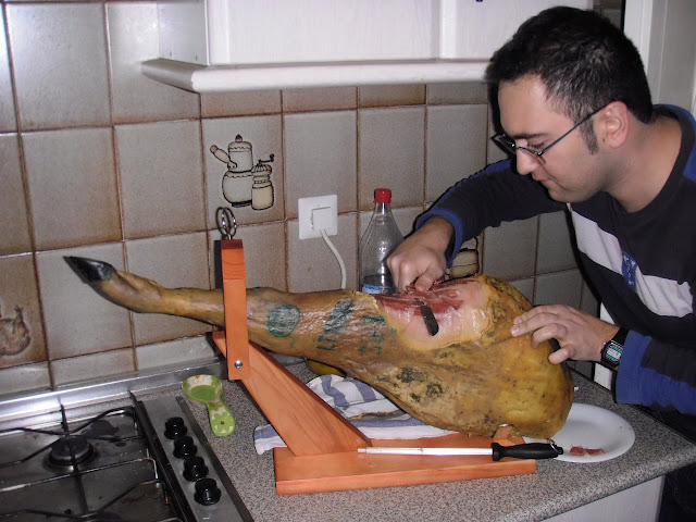 We had been talking about buying a leg of ham since we moved into this place. If you haven’t been to Spain, ham is their specialty. The best, jamon iberico, is absolutely delicious and a must try when you come for a visit. But it can be quite expensive in the bars and restaurants – 20-30 euros for a plate. We’ve got lots of people visiting so we decided to all go in and finally buy our own. I think having a leg of ham in the kitchen officially makes us Spanish. This ham is distinguished by the “pata negra” – the black hoof. The pigs are fed an acorn diet and because of this, the ham has a yummy nutty flavor. Here’s Babak digging in. I joke that at night when I get up to pee Im going to find one of the boys sneakily slicing bits of ham. It must be true because now, half of that thing is gone!
